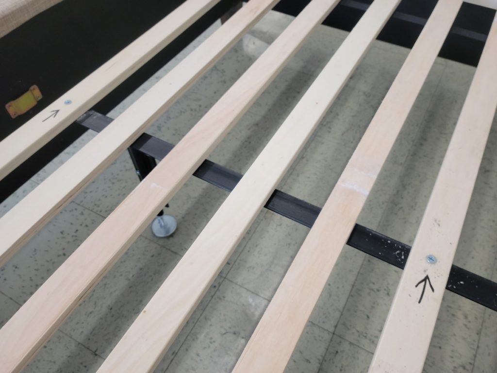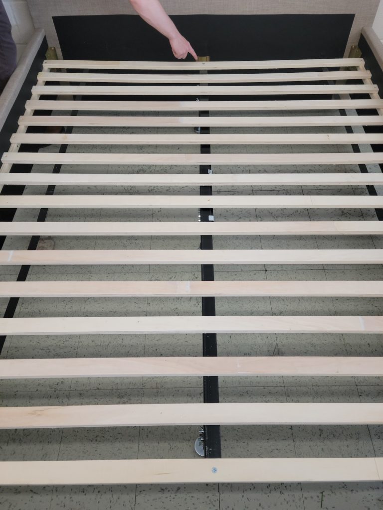 Queen, king, and California King all use two beams for longitudinal reinforcement. The beam(s) should be running head to toe beneath wooden slats that are spanning the bed’s width. A beam should be placed where the main weight will need to be supported. If there are two sleepers there will need to be a bar under each for each sleeper. Each beam should have a minimum of two legs. We recommend 3 legs per beam.